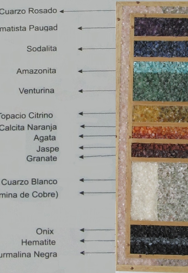 Está constituida por cristales naturales, colocados estratégicamente de acuerdo a la correspondencia de los colores de las zonas energéticas del paciente, en las siguientes cantidades: